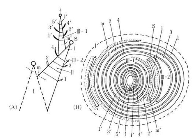 ヒガンバナの仮軸分枝システムを再度見直すと、ヒガンバナ一個の球根内に、花を咲かせる組織が茎軸「Ⅱ」先のS、茎軸「Ⅲ-1」先のfの二つあり、下図に記されていませんが、子球Ⅲ-2の生育が進めば、その先に花を持つ可能性があります。