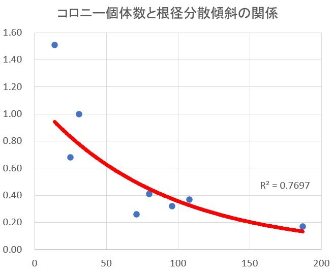 そのような、各コロニーの規模と近似直線の傾き(y=ax+bのa)、即ちコロニー個体球根径分布の関係をみたのが以下のグラフです。